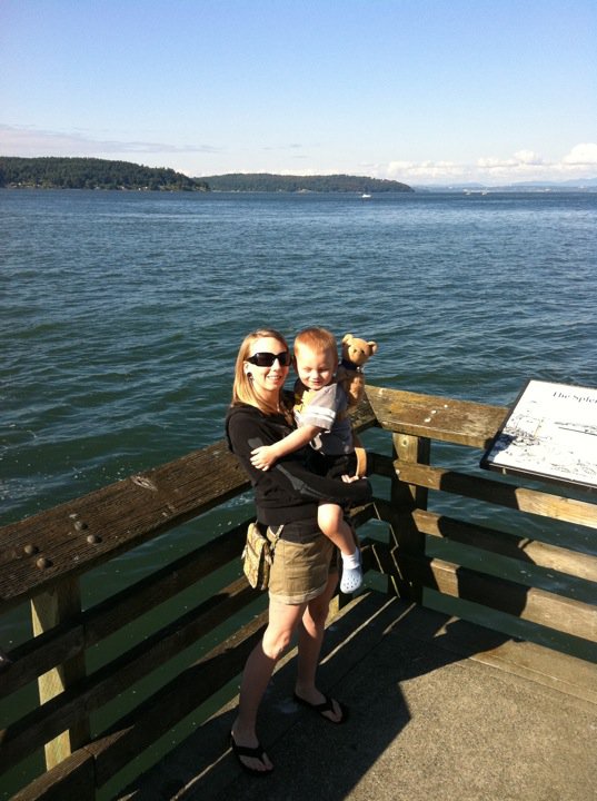 Well, We had big plans to go to last week's Taste of Tacoma festival, but when we got there Saturday afternoon the crowd was just insane. Both of my boys have a really hard time in big groups like that, so rather than stay we decided to go down to the pier instead. Best idea ever! Bubs has been near the ocean a few times since we have been in Washington, but he's never actually been in the water. It was FREEZING, but we had a blast splashing in the waves. Jam was super happy to just be out and about, being worn by his daddy, and was all smiles all day. :)